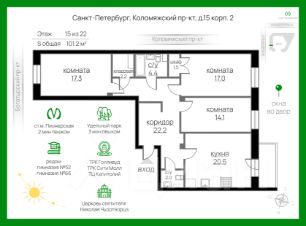 • Изолированные комнаты: 17,0 м², 17,4 м², 14,1 м²