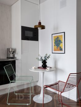 Пространство квартиры включает в себя кухню-гостиную, спальню-кабинет, коридор с выделенной зоной хранения и ванную комнату с функцией постирочной