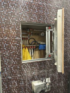 Санузел оборудован подвесным унитазом Geberit, душевой кабиной.
