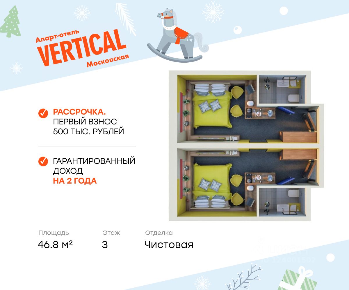 Продаются апартаменты 317, общей площадью 46.80 м2, расположенные на 3 этаже, в 1 корпусе инновационного апарт-отеля Vertical Московская. Помещение сдается с чистовой отделкой, мебелью и техникой.