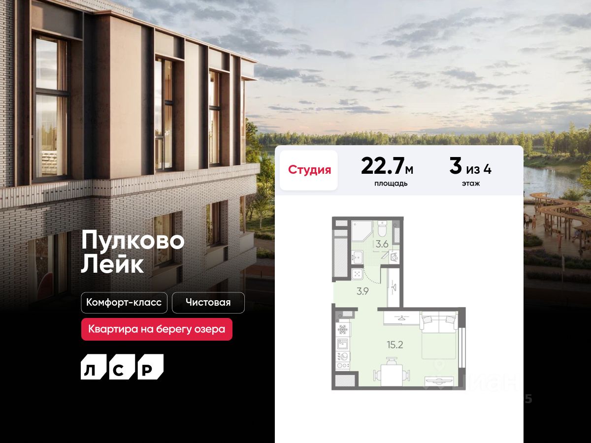 Продается студия в ЖК "Пулково Лейк" на 3 этаже. Общая площадь составляет 22.70 кв. м. Квартира с чистовой отделкой. Жилой комплекс "Пулково Лейк" располагается по адресу Санкт-Петербург, Московский.