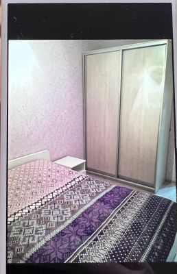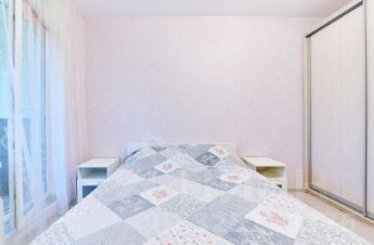 - Спальня 10,4 м² с кроватью Ikea для комфорта и отдыха. Прикроватные тумбы для удобства хранения книг, гаджетов и других мелочей. Шкаф-купе с раздвижными дверями для компактности.