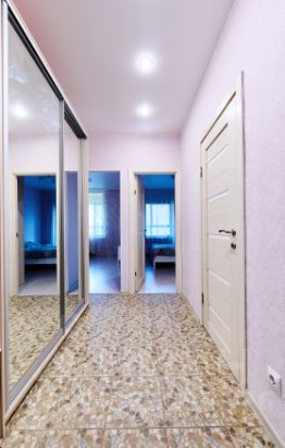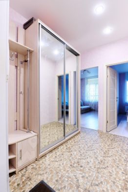 - В прихожей шкаф-купе с зеркалом — удобно скрыть одежду и проверить внешний вид перед выходом.