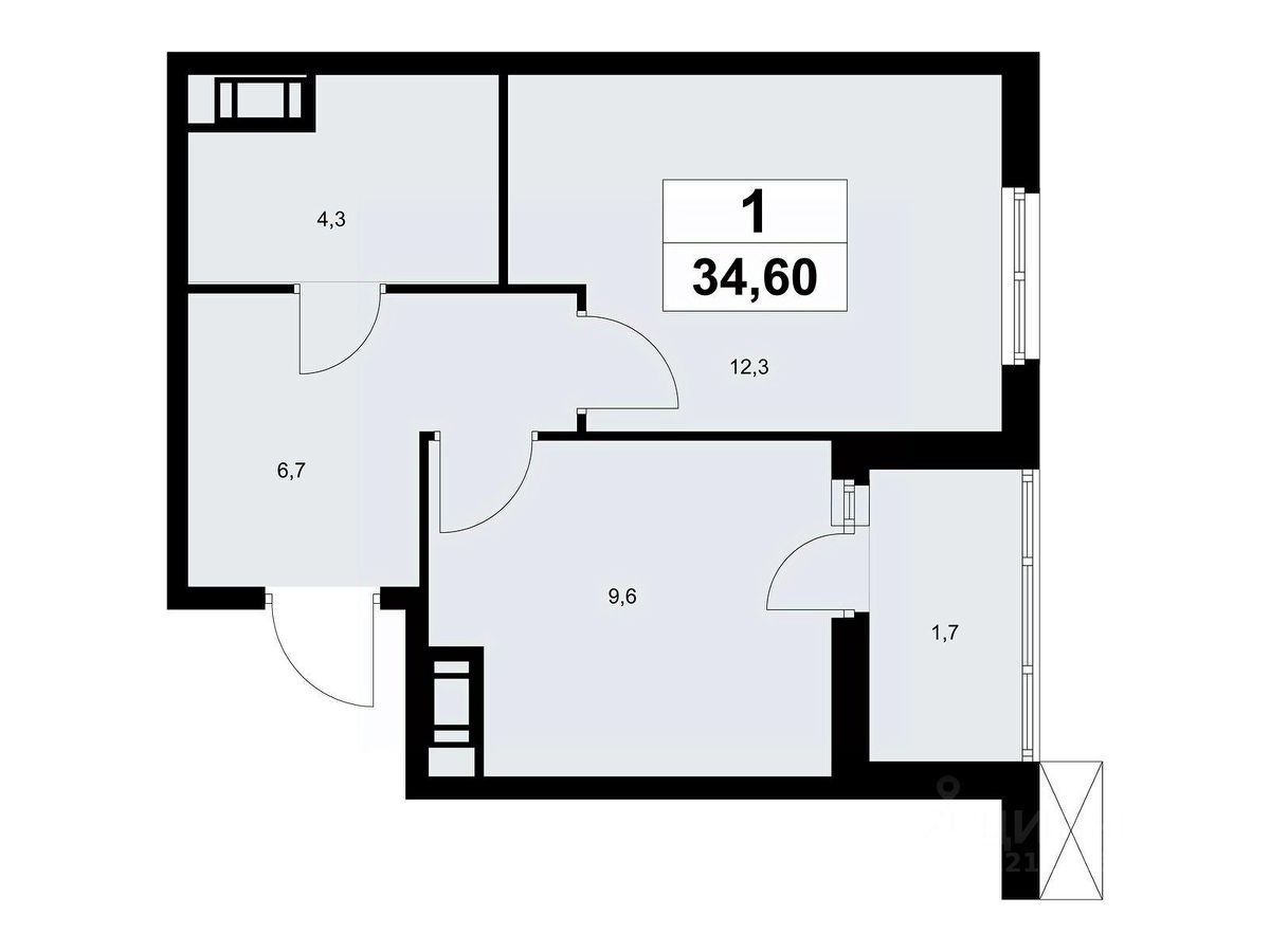 Общая площадь квартиры — 34,6 кв. м., этаж 3 из 9, секция 1