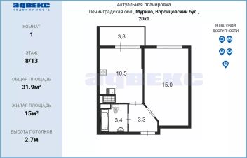 - Ликвидная локация: район с развитой инфраструктурой, включая службы и пункты доставки, кофейни, булочные, фитнес центры, с шаговой доступностью до метро-30 минут и 30 минут до центра города.