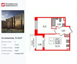 Удобная, классическая, функциональная европланировка, большая кухня-гостиная 14.12 м², вместительная прихожая 3.87 м². Общая площадь квартиры - 31.02 м², жилая 9.21 м², высота потолка 2.75 м.
