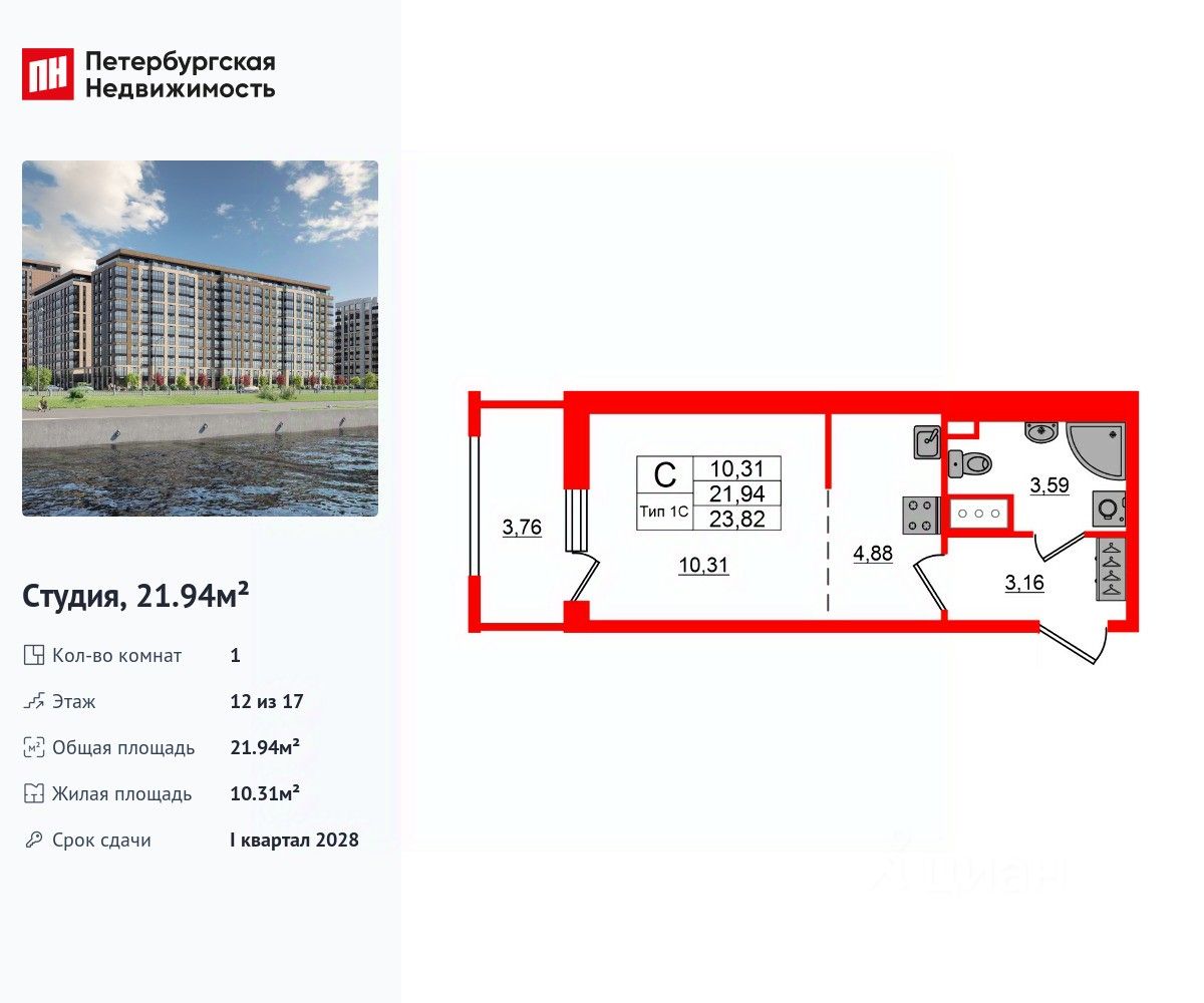 Удобная, классическая, функциональная европланировка, вместительная прихожая 3.16 м². Общая площадь студии - 21.94 м², жилая 10.31 м², высота потолка 2.77 м.