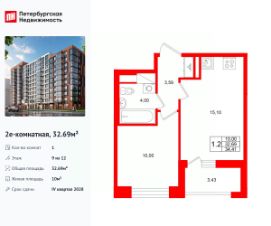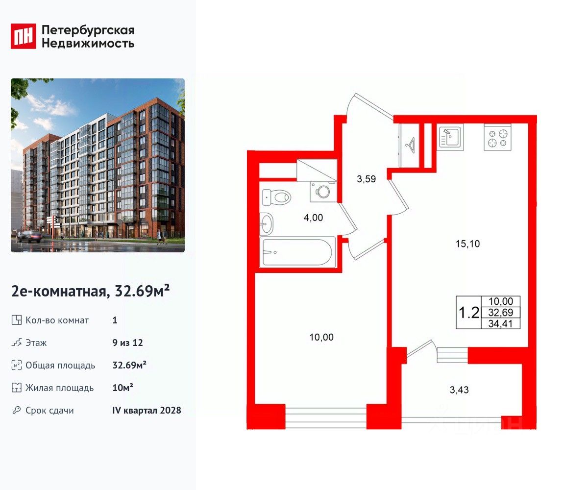 Удобная, классическая, функциональная европланировка, большая кухня-гостиная 15.1 м², вместительная прихожая 3.59 м². Общая площадь квартиры - 32.69 м², жилая 10 м², высота потолка 2.77 м.