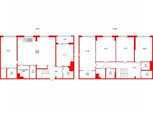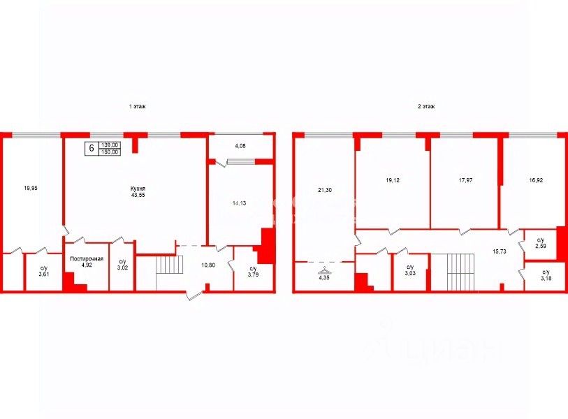 Общая площадь квартиры на двух этажах почти 300 м2, по 150 м2 на этаже. В квартире 6 санузлов и 4 гардеробных комнаты, включая постирочную. Комнаты имеют большие площади от 14,13 м2 до 21,30 м2. Кухня-гостиная размером как три современные студии 43,55 м2. Евроремонт выполнен на 95% - осталось отделать лестницу, поставить во все санузлы сантехнику, завезти мебель и можно жить!