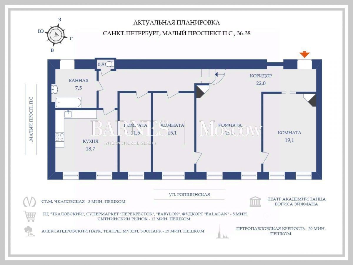 Ропшинская, 18 - тихая улица в двух шагах от метро Чкаловская. 8 минут - и вы на Неве или в лучших ресторанах района. Удобный выезд на ЗСД, рядом гимназии, детские сады, университеты и медицинские центры.