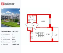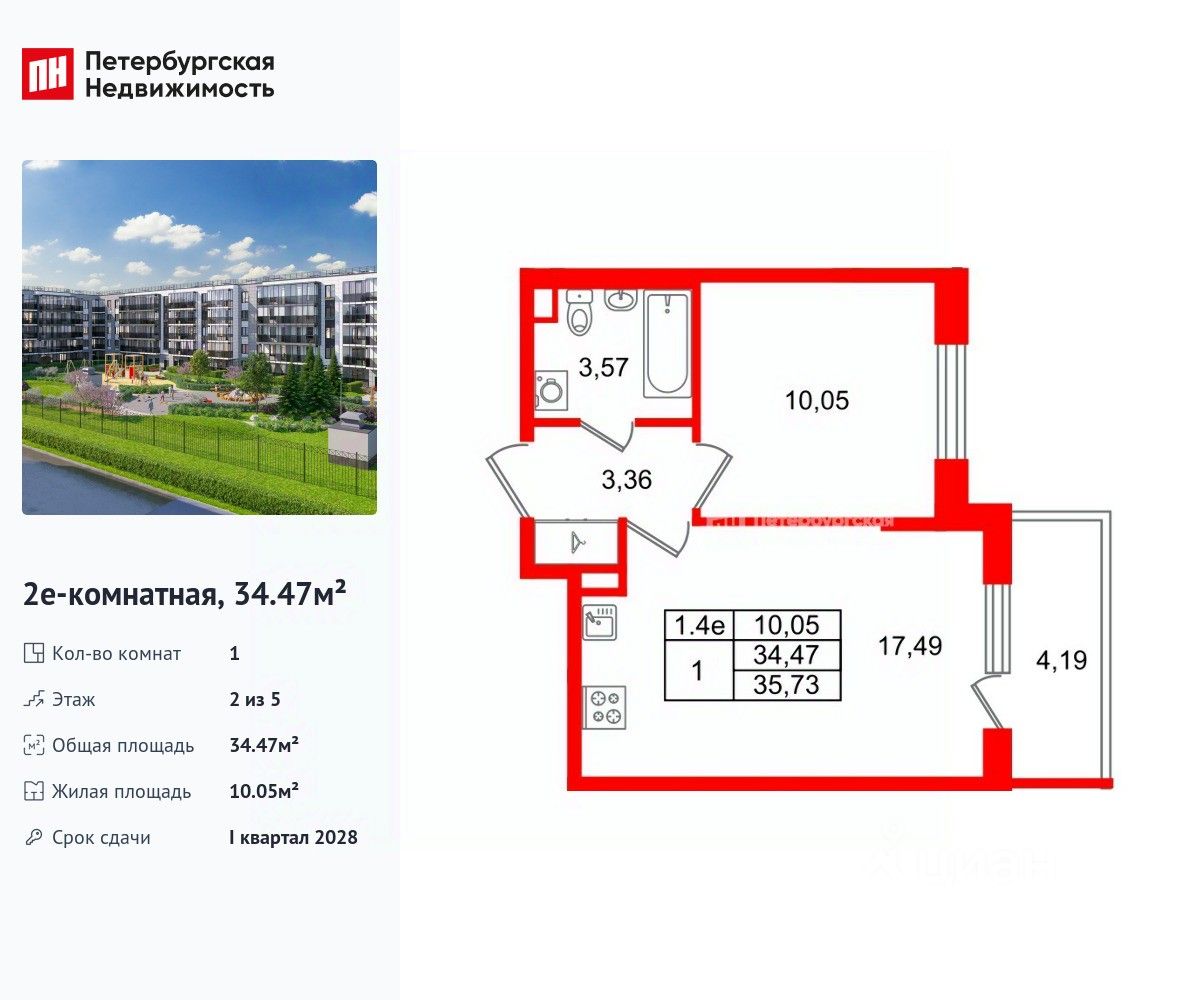 Удобная, классическая, функциональная европланировка, большая кухня-гостиная 17.49 м², вместительная прихожая 3.36 м². Общая площадь квартиры - 34.47 м², жилая 10.05 м², высота потолка 2.77 м.