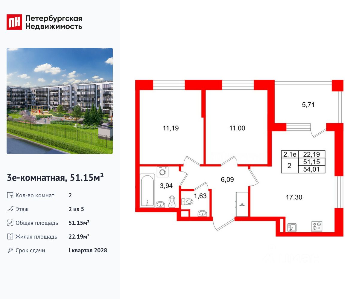 Удобная, классическая, функциональная европланировка, большая кухня-гостиная 17.3 м², вместительная прихожая 6.09 м². Общая площадь квартиры - 51.15 м², жилая 22.19 м², высота потолка 2.77 м.