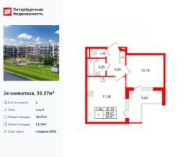 Удобная, классическая, функциональная европланировка, большая кухня-гостиная 17.36 м², просторная прихожая 5.05 м². Общая площадь квартиры - 39.27 м², жилая 12.19 м², высота потолка 2.77 м.