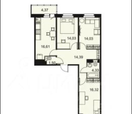 Общая площадь квартиры составляет 82 кв. м, из которых 44 кв. м — жилая площадь и 16.6 кв. м — кухня-гостинная, две комнаты по 14 м и спальня 16 м.