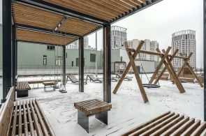 В доме есть подземный паркинг, лифт опускается в паркинг, внутренний двор огорожен и закрыт, расположен на стилобате, во дворе детские площадки и зоны отдыха.