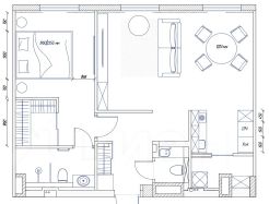 Планировка включает две комнаты, мастер- спальня и кухня гостинная ,два санузла.