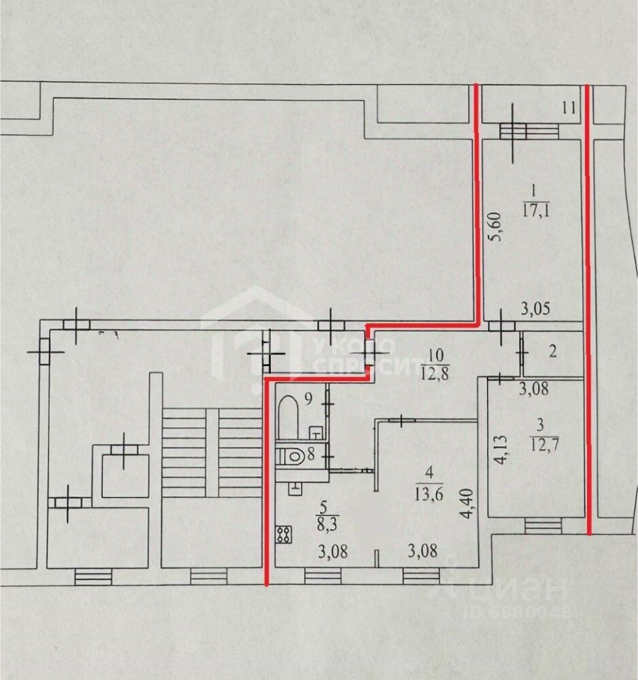 В квартире две раздельных жилые комнаты, площадью 17,7 кв.м., 12,7 кв.м. и комната 13,6 кв.м., объединена с 9 м. Кухней, просторная прихожая площадью 12 кв.м..