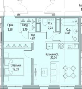 Планировка евро-2: кухня-гостиная 20,04 м², спальня 12,33 м², 2 санузла (4,38 и 2,24 м²), гардеробная 2,10 м².