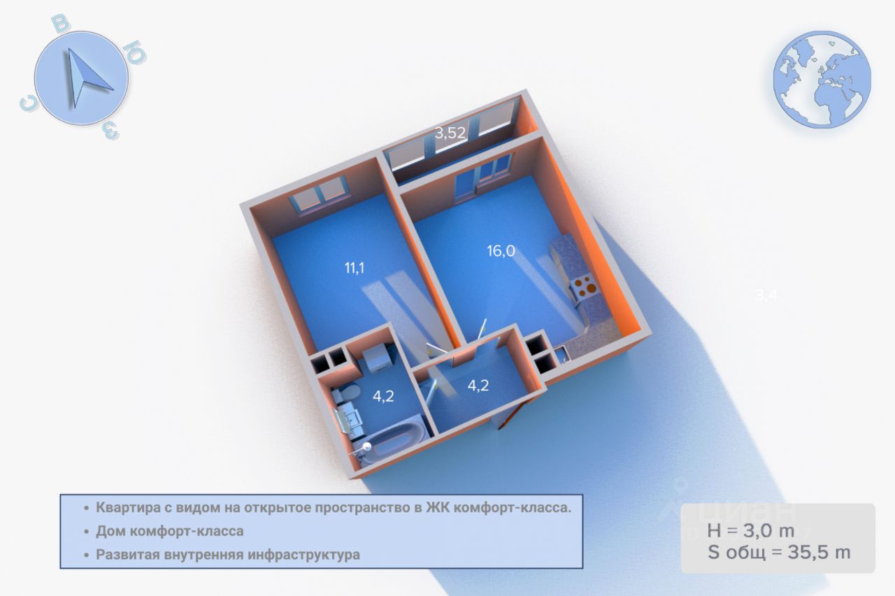 Квартира полностью готова к проживанию. Формат "заезжай и живи" без дополнительных вложений. Общая площадь — 35,5 м².