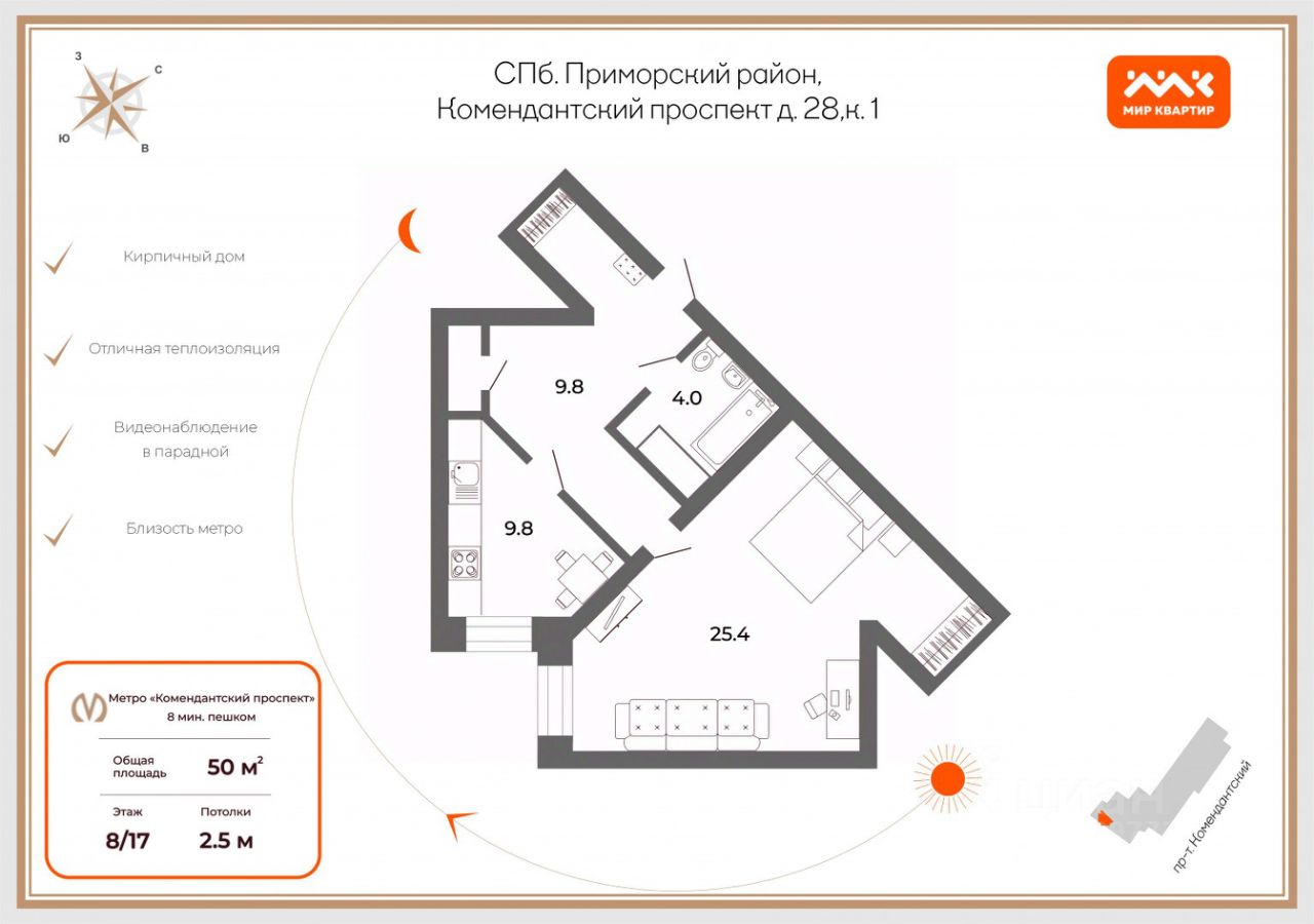 Просторная и однокомнатная квартира с ремонтом, расположенная в непосредственной близости от станции метро "Комендантский проспект" (всего 7 минут пешком).