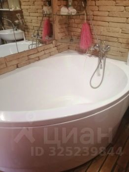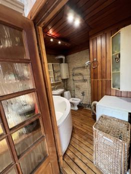 Ванная отделана декоративным камнем и полированной лиственницей покрытой лаком.