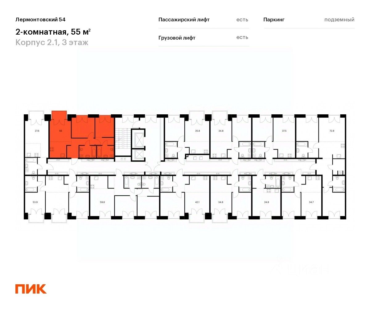 Продаётся 2-комн. квартира площадью 55 кв.м на 3 этаже 9 этажного дома (Корпус 2.1, Секция 2) проекта ПИК Лермонтовский 54. Светлый просторный подъезд на уровне земли, функциональная планировка, большие окна, без отделки.
