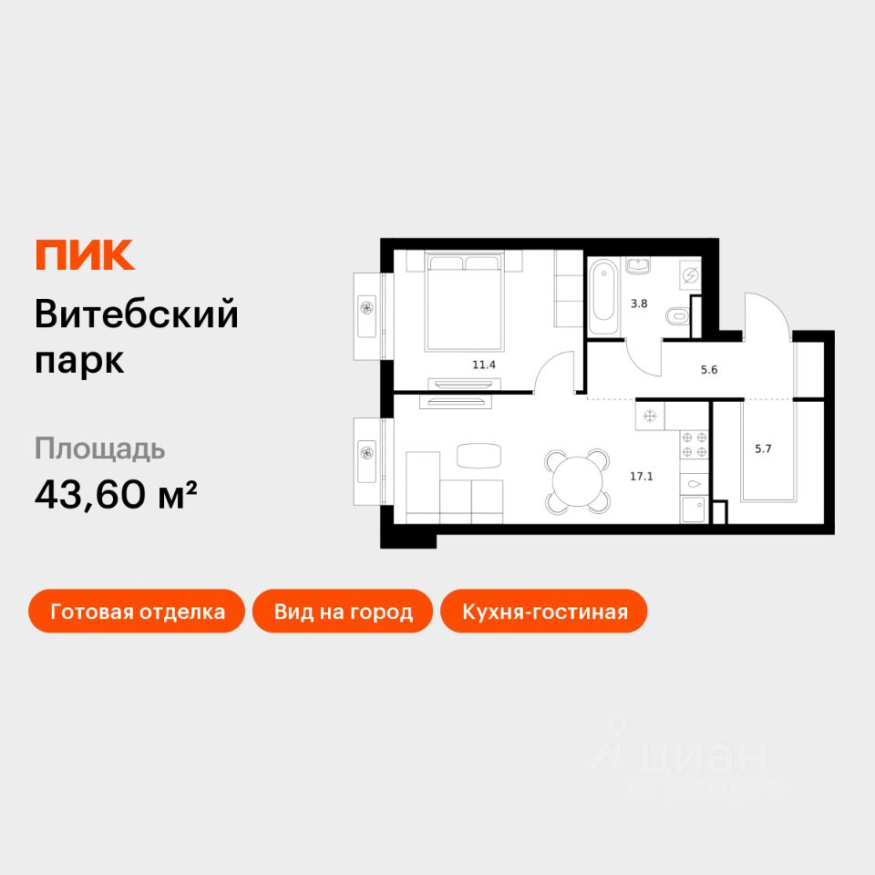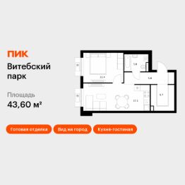Продаётся 1-комн. квартира площадью 43,6 кв.м на 9 этаже 12 этажного дома (Корпус 6, Секция 3) проекта ПИК Витебский парк. Светлый просторный подъезд на уровне земли, функциональная планировка, большие окна, c отделкой.