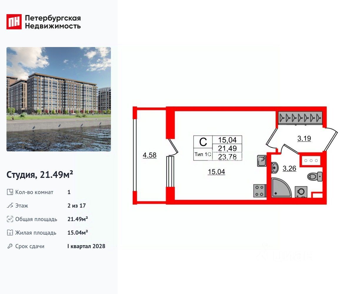 Удобная, классическая, функциональная европланировка, вместительная прихожая 3.19 м². Общая площадь студии - 21.49 м², жилая 15.04 м², высота потолка 2.77 м.