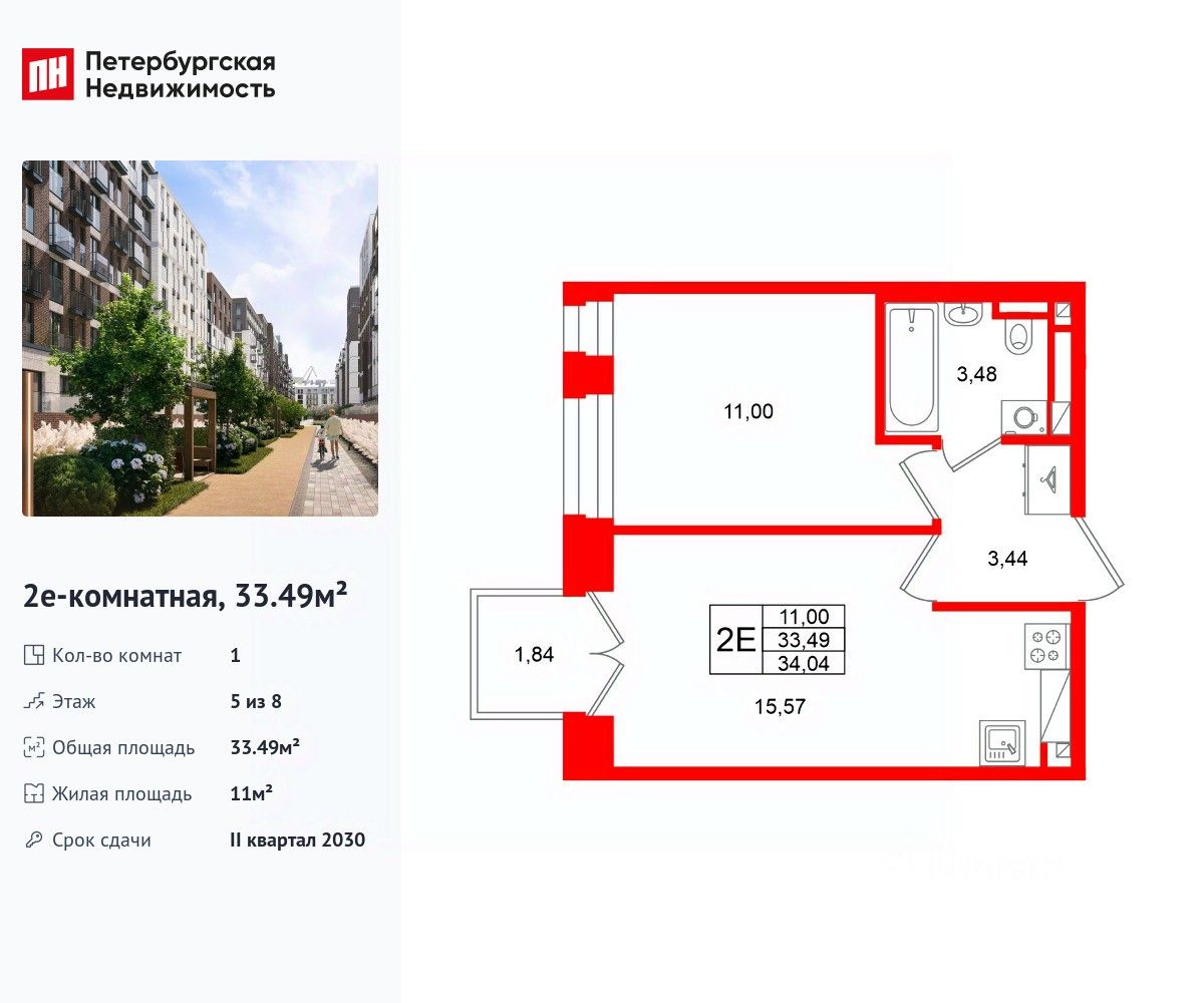 Удобная, классическая, функциональная европланировка, большая кухня-гостиная 15.57 м², вместительная прихожая 3.44 м². Общая площадь квартиры - 33.49 м², жилая 11 м², высота потолка 2.7 м.