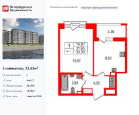 Уникальная планировка, кухня 9.63 м², просторная прихожая 4.32 м². Общая площадь квартиры - 31.65 м², жилая 14.07 м², высота потолка 2.77 м.