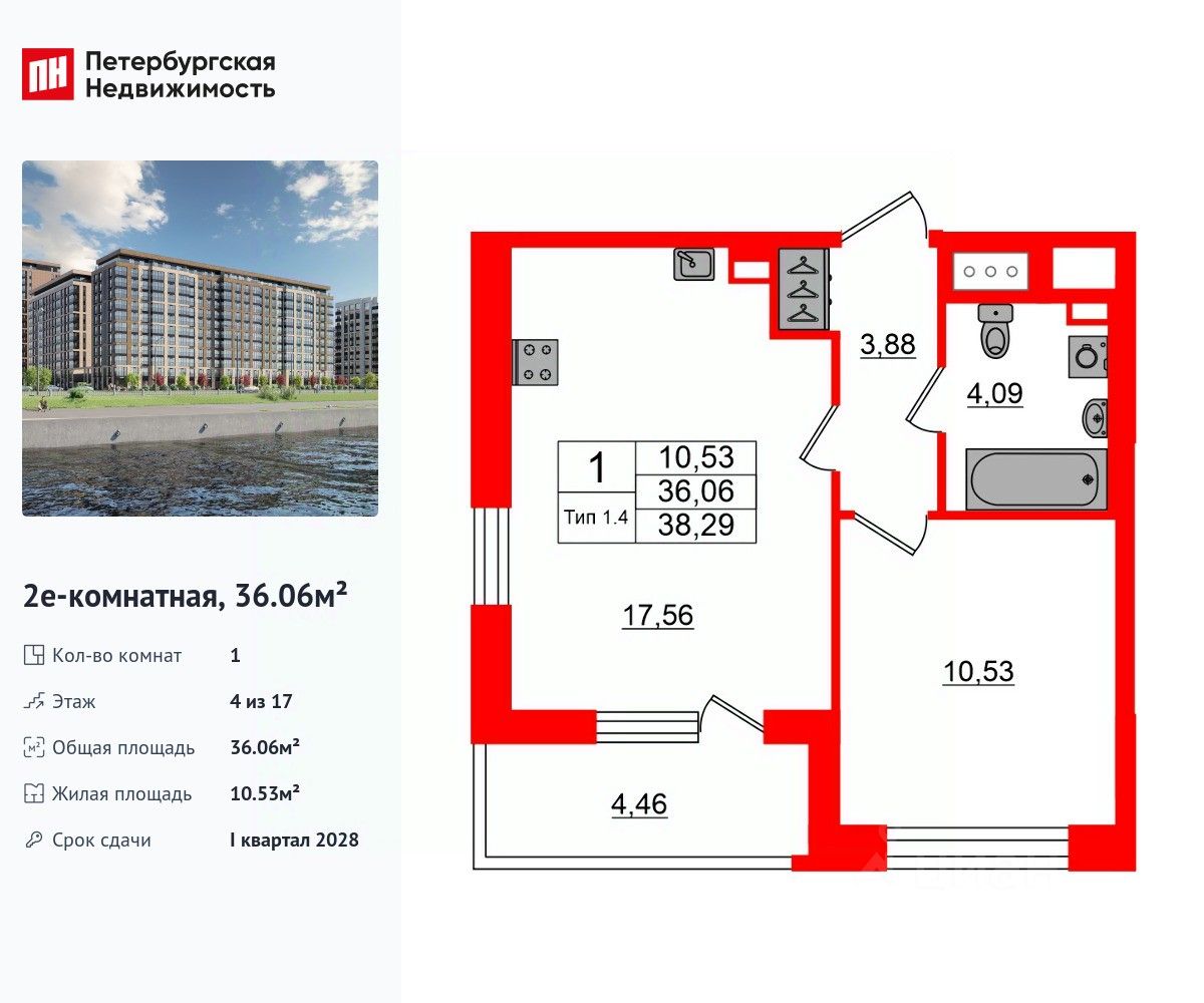 Удобная, классическая, функциональная европланировка, большая кухня-гостиная 17.56 м², вместительная прихожая 3.88 м². Общая площадь квартиры - 36.06 м², жилая 10.53 м², высота потолка 2.77 м.