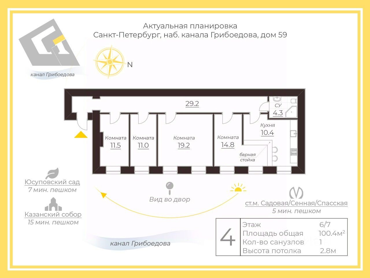 Культовое место Петербурга — набережная канала Грибоедова с видами на воду, купола и крыши. В пешей доступности: Исаакиевский и Никольский соборы, Мариинский театр, Адмиралтейство, Дворцовая площадь, Юсуповский сад. Рядом: Демидов мост, переулок Гривцова, Бертгольд Центр, ТЦ ПИК, Сенной рынок. Квартал насыщен лучшими кафе, барами и гастрономическими местами города.