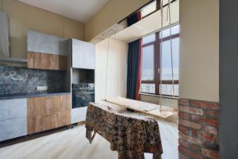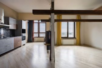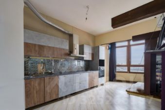 Кухня совмещена с гостиной. Стандартная кухонная мебель Лазурит с форнитурой Blum, со встроенной техникой: варочная поверхность Hansa, духовой шкаф и ПММ Bosch. Кухонная мойка Omoikiri с диспоузером BoneCrusher. Сделано дополнительное утепление и звукоизоляция полов и стен, смонтированы теплые полы. Гостиная и спальня декорируются под Ваши вкусы. Только в квартирах на последнем этаже потолок 3,1 м, поэтому возможно сделать небольшой второй уровень в качестве детской игровой зоны (для этого и монтировались балки)