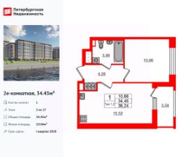 Удобная, классическая, функциональная европланировка, большая кухня-гостиная 15.52 м², просторная прихожая 4.28 м². Общая площадь квартиры - 34.45 м², жилая 10.66 м², высота потолка 2.77 м.