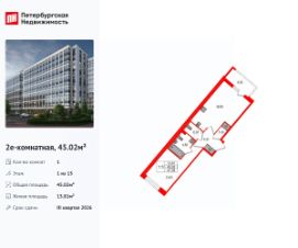 Удобная, классическая, функциональная европланировка, большая кухня-гостиная 18.85 м², просторная прихожая 4.31 м². Общая площадь квартиры - 45.02 м², жилая 13.81 м², высота потолка 2.75 м.