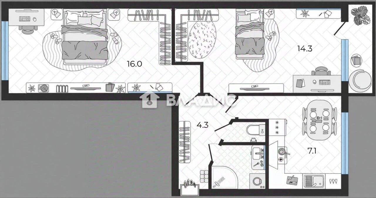 Квартира расположена на третьем этаже пятиэтажного дома 1972 года постройки. Общая площадь составляет 44,6 кв. м, из которых 30,3 кв. м — жилая площадь, 7,1 кв. м — кухня. Высота потолков — 2,6 м, что создаёт ощущение простора и свободы. Комнаты изолированы, окна выходят на улицу.