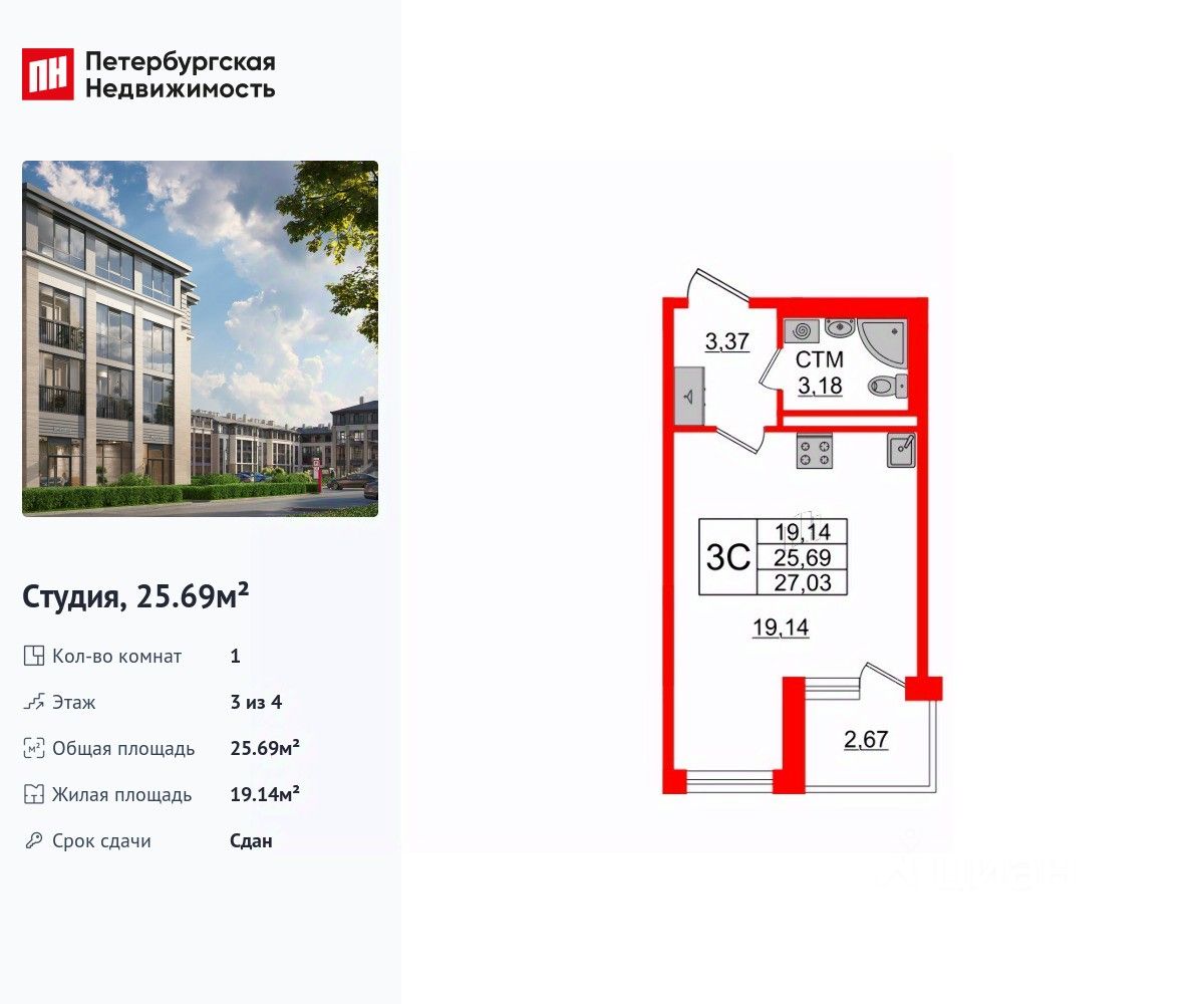 Продается просторная студия в жилом комплексе "Дворцовый фасад" в неповторимом Петродворцовом районе. До метро можно добраться на транспорте всего за 25 минут. Удобная, классическая, функциональная европланировка, просторная прихожая 3.37 м². Общая площадь студии - 25.69 м², жилая 19.14 м², высота потолка 3.07 м. Квартира продается с отделкой "NORD LINE WHITE". Что особенного в ЖК "Дворцовый фасад"? • В окружении дворцово-парковых ансамблей: Стрельна, Константиновский дворец, Петергоф, парк Новознаменка и Сосновая поляна, Шунгеровский лесопарк • Два собственных парка: парадный верхний для спокойного отдыха, нижний для активных занятий • Проект, соответствующий стандартам экологичного строительства, энергоэффективности, экономии и комфорта • Квартиры с саунами, возможностью установки камина и палисадниками • Малоэтажный жилой комплекс: всего 4 этажа, более половины квартир с увеличенной высотой потолка: от 3 до 5,5 м