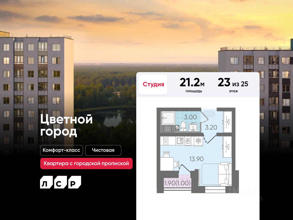 Продается студия в ЖК "Цветной город" на 23 этаже. Общая площадь составляет 21.20 кв. м. Квартира с чистовой отделкой Срок сдачи дома: 4 квартал 2025. Жилой комплекс "Цветной город" располагается по адресу Санкт-Петербург, Красногвардейский.
