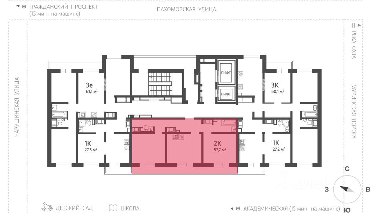 • 15 минут на авто до станций "Гражданский проспект" и "Академическая";