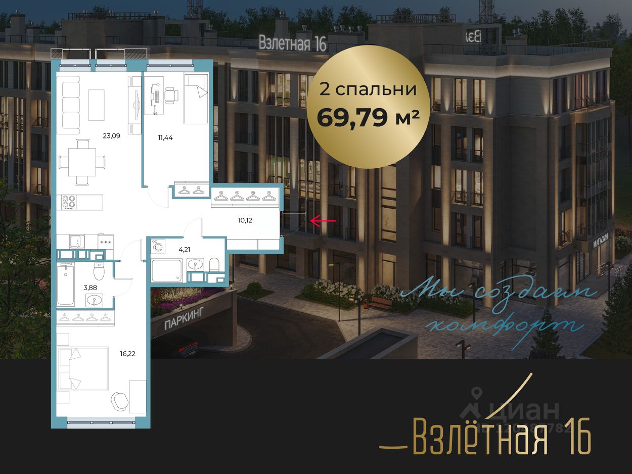 Новый ЖК "Взлетная 16", камерный малоэтажный дом на 68 квартир. Дом состоит из трех 5-этажных секций. Комплекс является уникальным за счет небольшого количества квартир с большим выбором продуманных планировочных решений.
