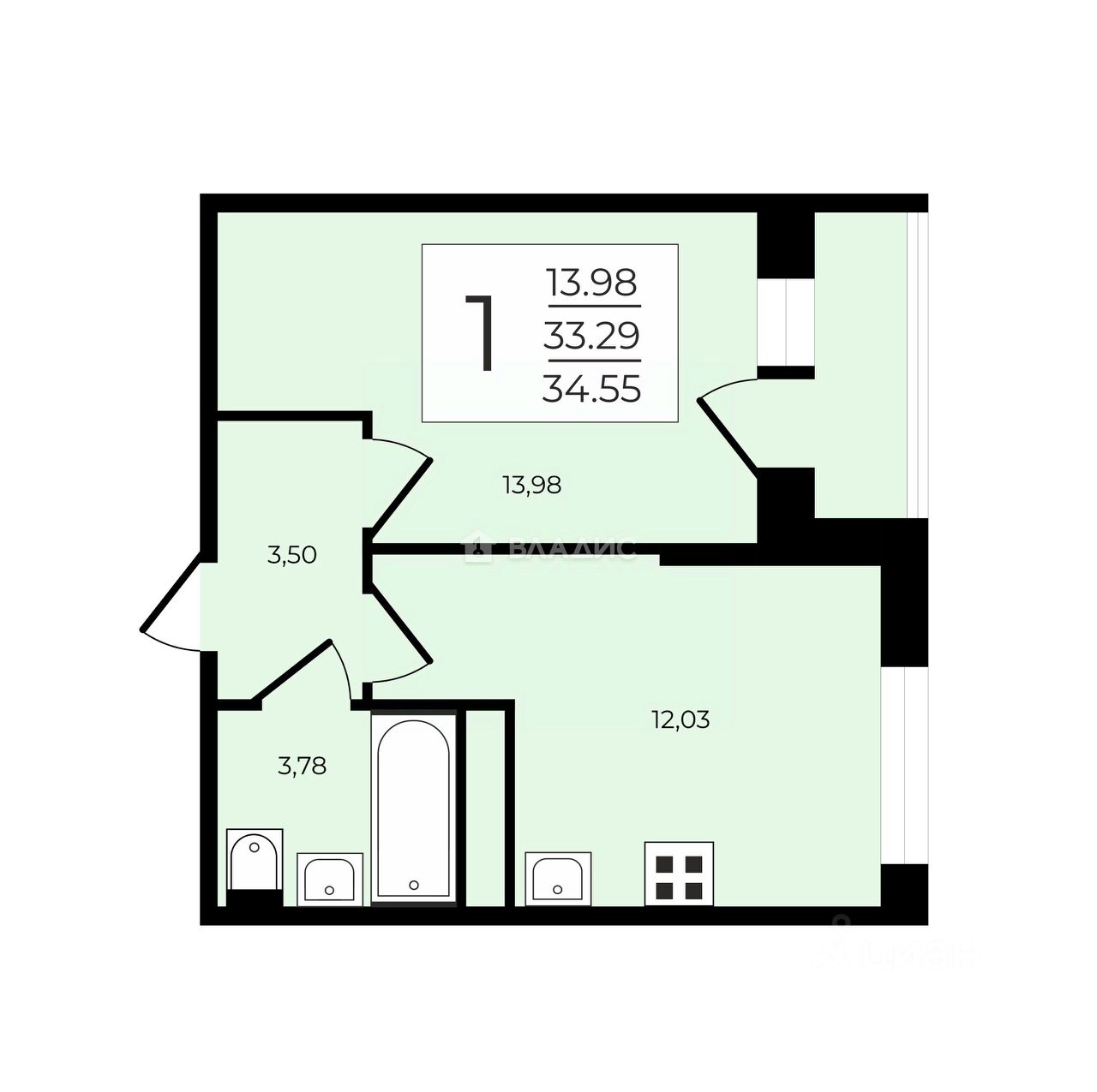 Материал постройки — монолит, перекрытия — железобетонные плиты. Квартира имеет общую площадь 33,29 кв. м, включая просторную кухню площадью 12,03 кв. м.