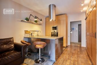 На которой установлена мебель с учетов всех последних тенденций моды. Большой кухонный остров с варочной поверхностью и мойкой. На нем широкие места с барными стульями. Это так удобно, готовить и тут же угощать друзей или родственников. Встроенная кухонная техника и холодильник спрятаны в вертикальные пеналы с отделкой натуральтным шпоном.