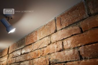 Стена между кухней и гостиной с двух сторон обложена натуральным кирпичем, с именными вставками.