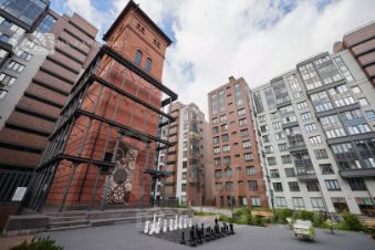 В доме свой закрытый от машин врутренний двор. На нем высажены растения, установлен фонтан. Для детей организованы горки и пространство с настоящими шахматными фигурами.