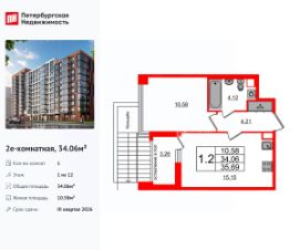 Удобная, классическая, функциональная европланировка, большая кухня-гостиная 15.15 м², просторная прихожая 4.21 м². Общая площадь квартиры - 34.06 м², жилая 10.58 м², высота потолка 2.77 м.