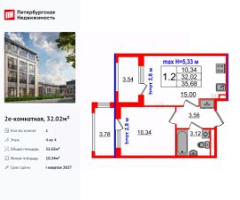 Удобная, классическая, функциональная европланировка, большая кухня-гостиная 15 м², вместительная прихожая 3.56 м². Общая площадь квартиры - 32.02 м², жилая 10.34 м².
