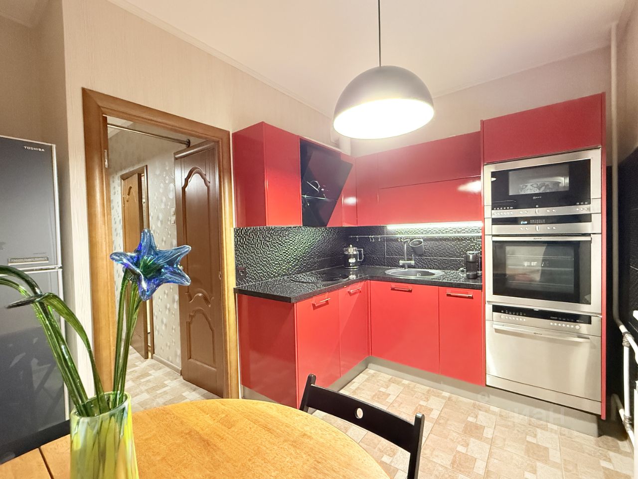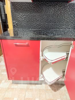 компактная угловая кухня укомплектована максимальным набором встроенной бытовой техники: духовка, микроволновка, посудомоечная машина, вытяжка. Удобные вместительные ящики с выдвижными механизмами. Столешница из натурального монолитного гранита. Большой холодильник.