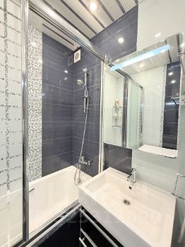 Санузел — раздельный, отделанный качественной плиткой с современной сантехникой и скрытой системой инсталляции унитаза.