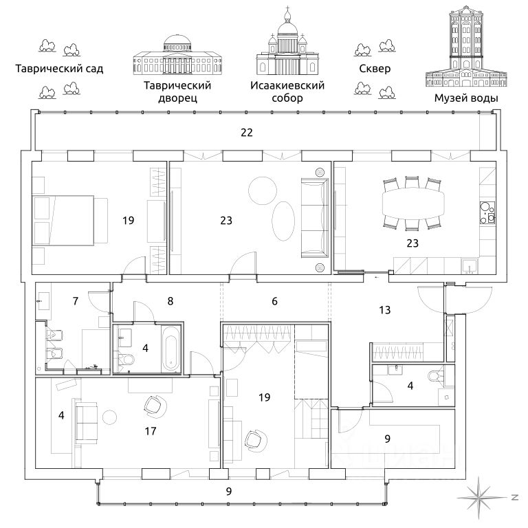 В шаговой доступности Таврический сад, гимназия Альма Матер, фитнес-клуб Parus.