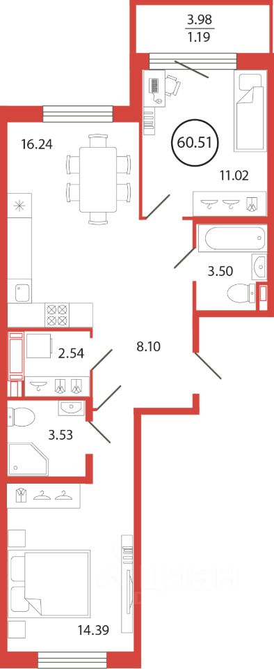 Продаётся e3 комнатная квартира (евро) в жилищном комплексе "Энфилд" (корпус Дом 18 секция 3). Общая площадь 60,51 кв. м, площадь комнат 14,39 кв.м, 11,02 кв.м. 2 санузла. Квартира расположена на 6 этаже 12 этажного дома. Срок сдачи корпуса IV квартал 2027 года.